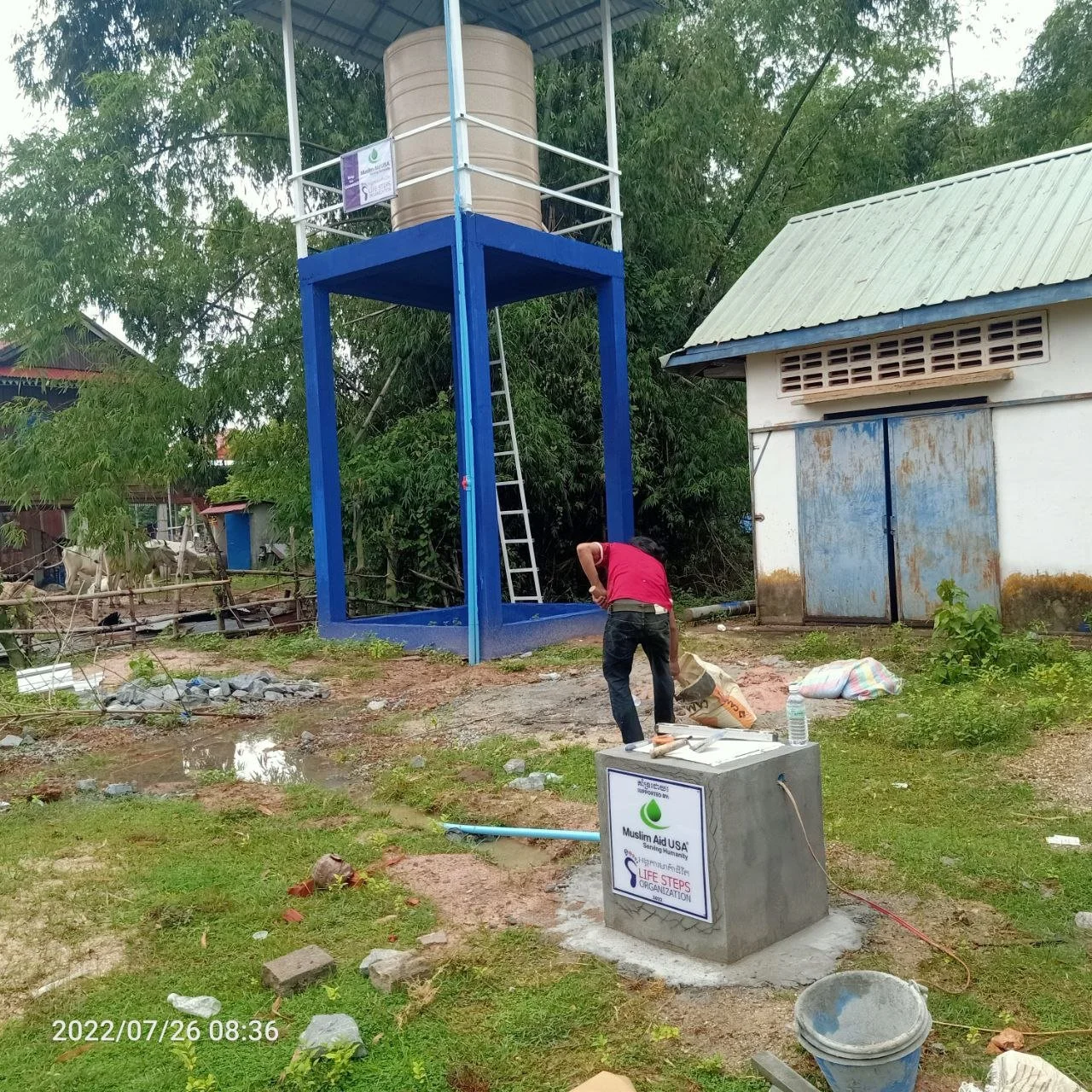 LSO strongly believes that ensuring a safe water supply is vital to keeping Cambodian people healthy and contributing to the country's development. We have long experience in the area of rural water supply improvement through the installation of water wells for the needy and poor families or community institutions such as schools, mosques, pagodas, health centers that cannot afford to buy and installed water-well –easy access to safe water for the family, children, and for the neighboring populations. In support of MA-USA, LSO implemented this community safe water supply system free of charge to the remote villages. We bring safe water to the doorstep of each house in a rural village, from a deep-drill water well and an overhead tank (powered by an electric or solar pump).